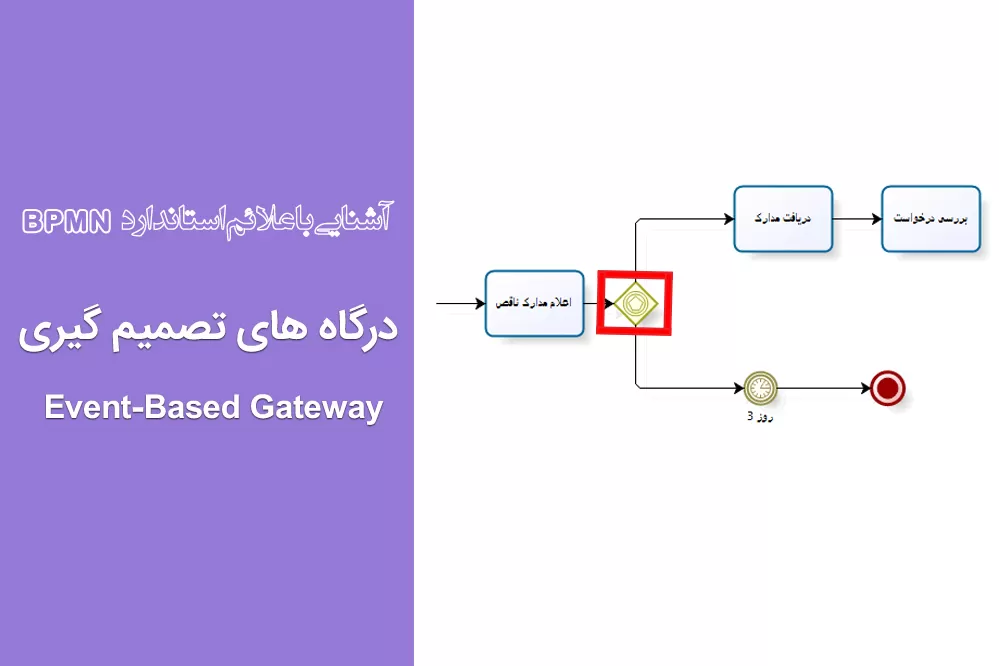همانطور که مشاهده میکنید تصمیمگیری کنسل کردن یا نکردن درخواست منوط به تکمیل مدارک قبل از سه روز و عدم مراجعه بعد از سه روز میباشد، پس شرط تصمیمگیری بر اساس رویداد Timer میباشد. جهت مدلسازی موارد مشابه با مثال فوق از درگاه تصمیمگیری بر اساس رویداد استفاده میکنیم که در شکل زیر نشان داده شده است.